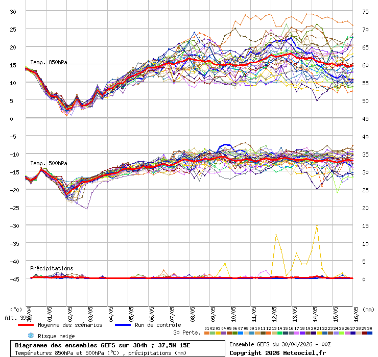 sono riportate la temperatura a 850 hPa (pari ad una quota mediamente di circa 1400 m slm)