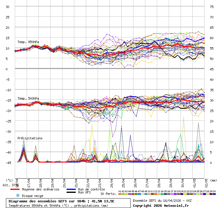 sono riportate la temperatura a 850 hPa (pari ad una quota mediamente di circa 1400 m slm)