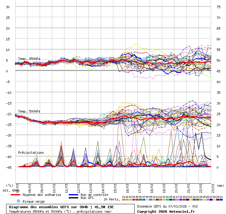e la temperatura a 500 hPa (pari ad una quota mediamente di circa 5500 m slm) con valori in °C