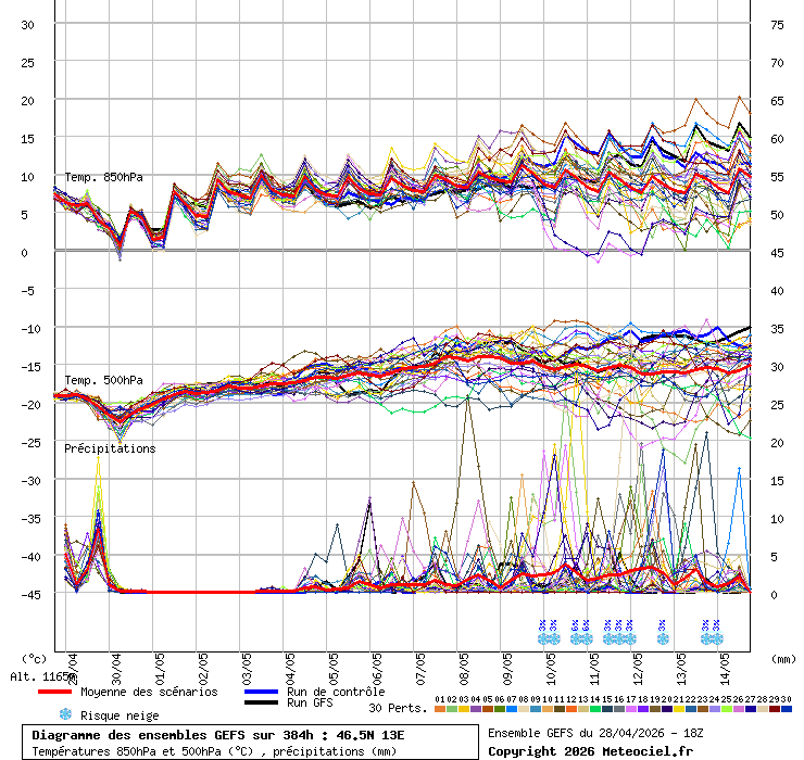 sono riportate la temperatura a 850 hPa (pari ad una quota mediamente di circa 1400 m slm)